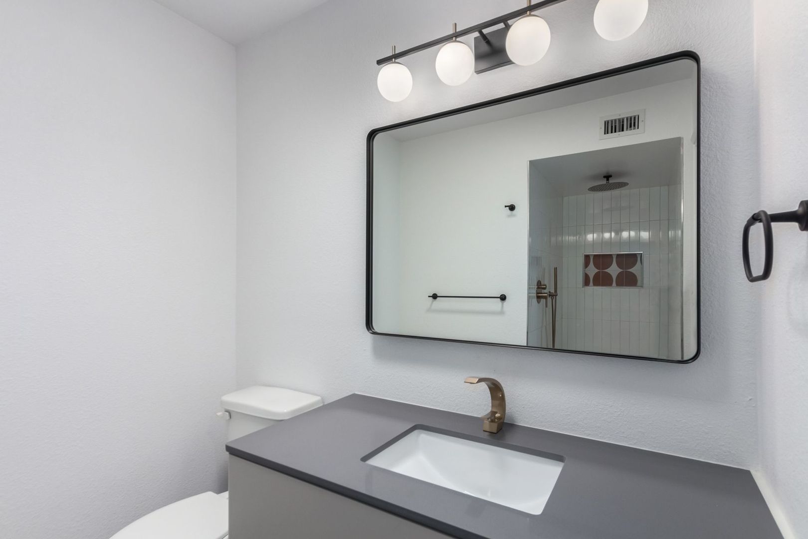 Both bathrooms have walk-in showers with hand painted concrete shower tile